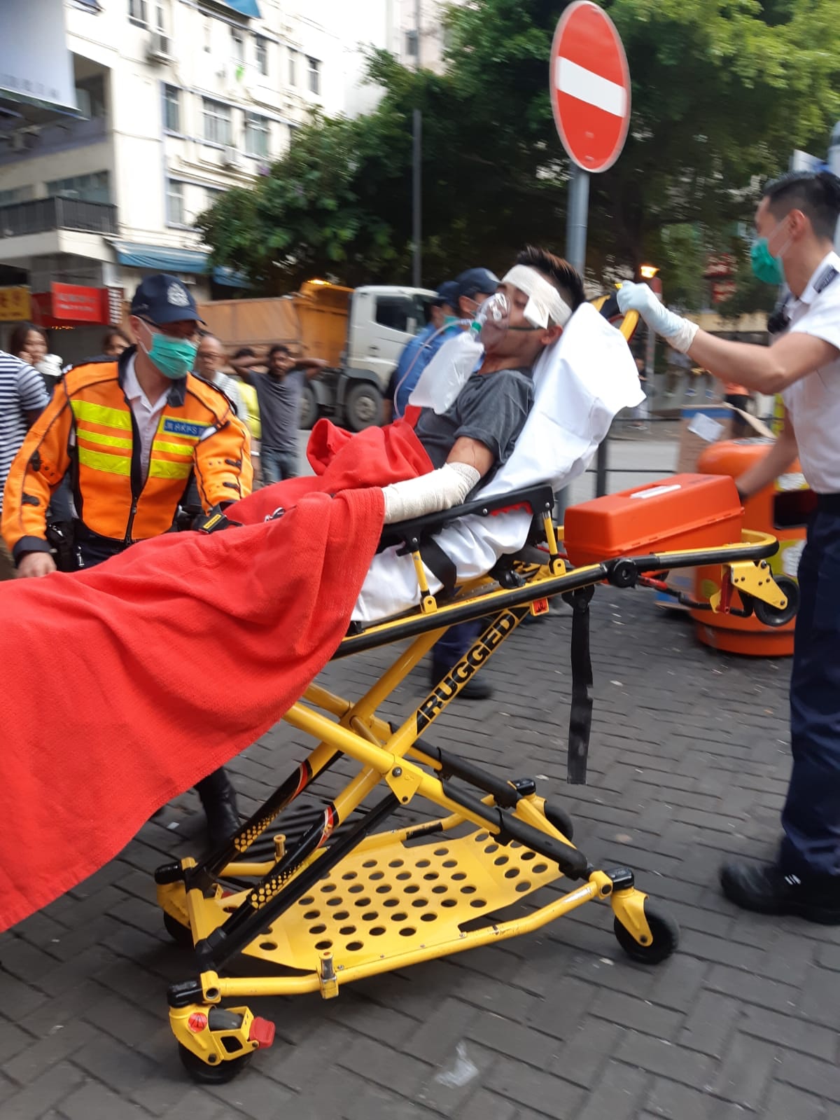 Trang tin tức HK01.com đưa tin, nạn nhân bị thương ở cánh tay phải và trán, bị mất rất nhiều máu, đã được đưa đến bệnh viện trong tình trạng bất tỉnh.
