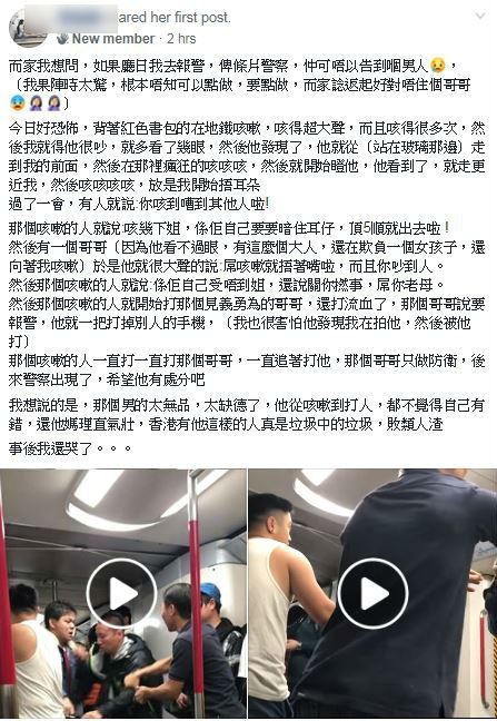 The one-minute video was uploaded by a woman to a Facebook group and explained the reason behind the fight, news website HK01.com reported. The woman said that when she took the train on Tuesday, a man carrying a red backpack in the same carriage kept coughing, but was not wearing a mask or covering his mouth with tissues or his hands.