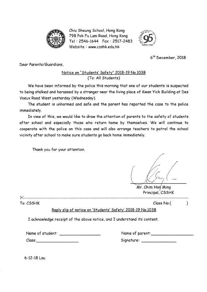 The primary school has issued a notice to parents informing them of the incident, saying that although the pupil was unharmed, the school wanted to warn parents and students, especially those who returned home by themselves, news website HK01.com reported.