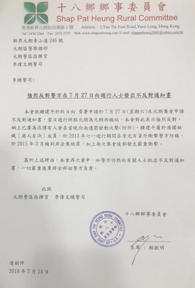 Earlier reports said the Shap Pat Heung Rural Committee sent a letter and warned that the police “will bear all consequences” if the march goes ahead.