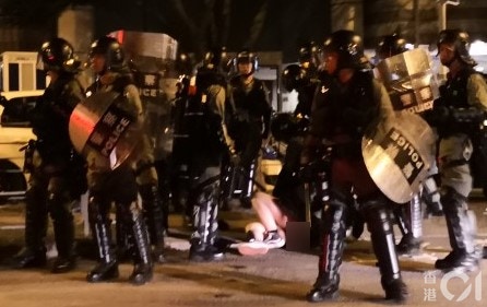 At the Tin Shui Wai Police Station, hundreds of protesters gathered after five police officers were seen taking off the dress and underpants of a female protester during an arrest on Sunday evening. The police action was recorded in video footage by people at the scene. A police spokeswoman said Monday that the female protester was struggling and not cooperative during the arrest. At about 2:30pm, riot police fired tear gas to disperse protesters surrounding the police station.