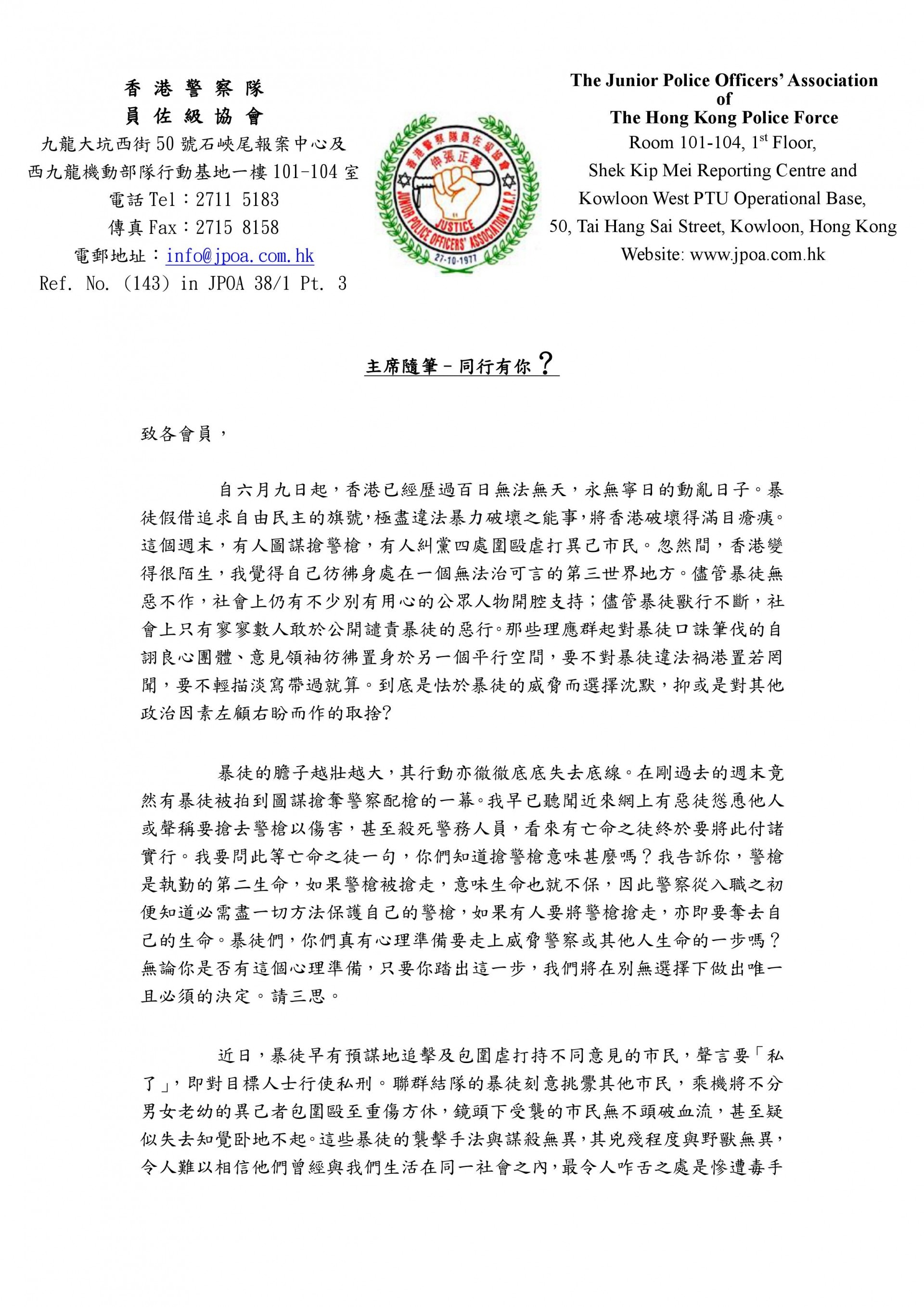 Lam made the comments in a letter to his 20,000 fellow members on Monday and warned that such action would leave the force with no choice but to take “necessary” action. But he did not say what that was.