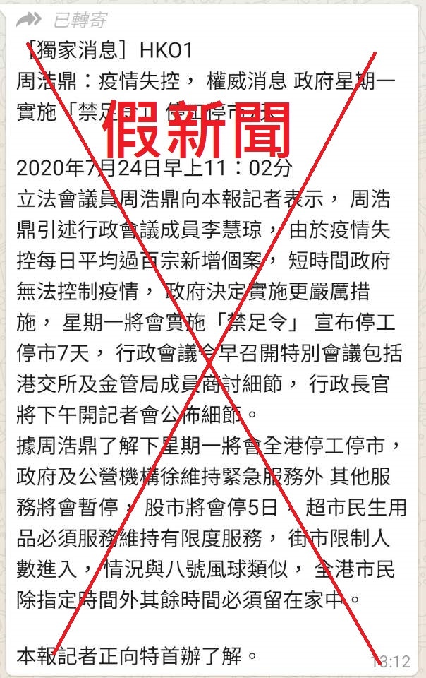 On Friday noon, a rumor was being shared among pro-Beijing citizens over WhatsApp that the Hong Kong government would completely lock down the city for seven days from July 27, close the stock markets for the week and reduce public services and necessity supplies. It cited Holden Chow, a lawmaker of the Democratic Alliance for the Betterment and Progress of Hong Kong, and claimed that it was an exclusive news from HK01.com.
